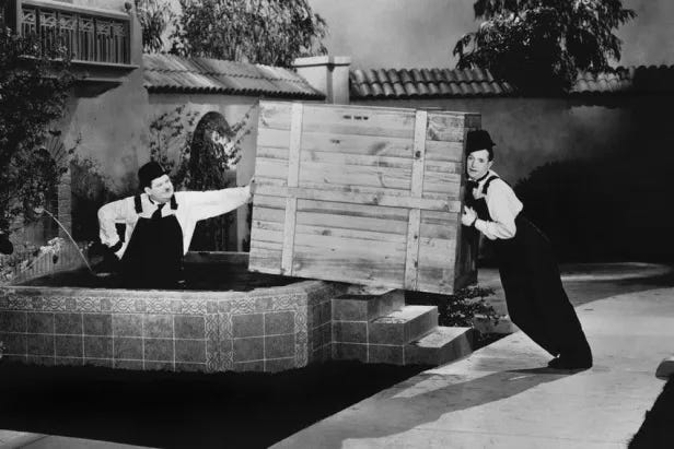 Brilliant observation about the shared predicament being the key ingredient, not just two funny people doing seperate bits. Modern comedy duos miss this when they each try to be the star instead of being equaly stuck. My grandfather used to talk about seeing Laurel and Hardy shorts at the cinema in Worcester as a kid, he said the audiense would laff harder when they were struggling together than when one was getting hit.